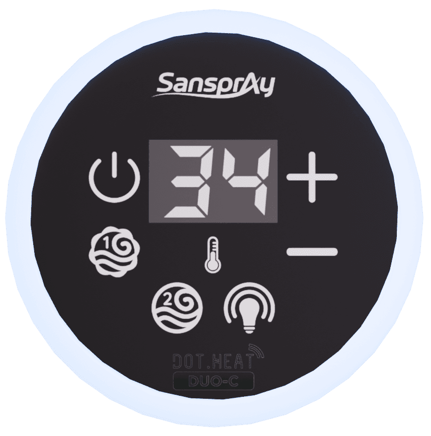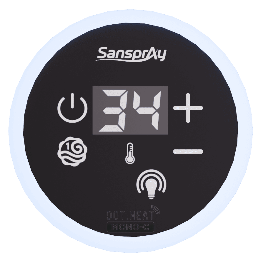 Controle via aplicativo Sanspray, permitindo ajuste de temperatura, iluminação e inicialização automática de saídas.